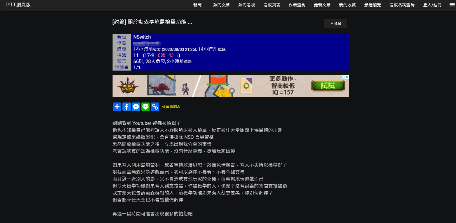 消息一出,有網友將該情況轉貼至PTT發文,討論動森夢境島檢舉功能,該名網友直指「檢舉功能有可能只是徒增玩家困擾」,且說道「如果遭到惡意檢舉,會不會沒有討論空間就直接收到任天堂的官方警告信?」,該網友也舉出魏巍被封鎖的例子來舉證,官方並沒有詳細給出解釋就將玩家的門牌號碼收回,檢舉機制也在網路上引起廣大討論。