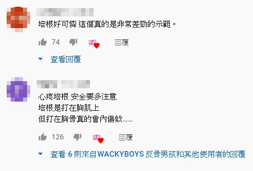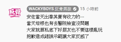 對此,反骨也在影片標題提醒「搥胸口是錯誤示範請勿模仿」,同時也在留言處坦承是錯誤示範,當天孫安佐出拳有收力,培根有到醫院檢查沒有問題,「大家就算私底下好朋友也不要這樣亂玩,抱歉造成錯誤示範讓大家反感了」。