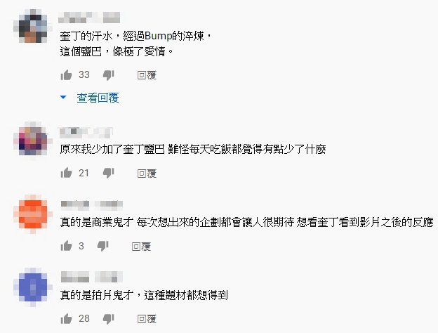 Bump影片一出,立刻引起許多網友關注,紛紛留言表示,「奎丁的汗水,經過Bump的淬煉,這個鹽巴,像極了愛情」、「幹!那件原味的更值錢」、「真的是商業鬼才,每次想出來的企劃都會讓人很期待」、「真的是拍片鬼才,這種題材都想得到」、「bump 企劃之神」、「賣那件原味運動內衣應該值更多錢吧」、「原來運動流汗是要收集鹽巴xd」。