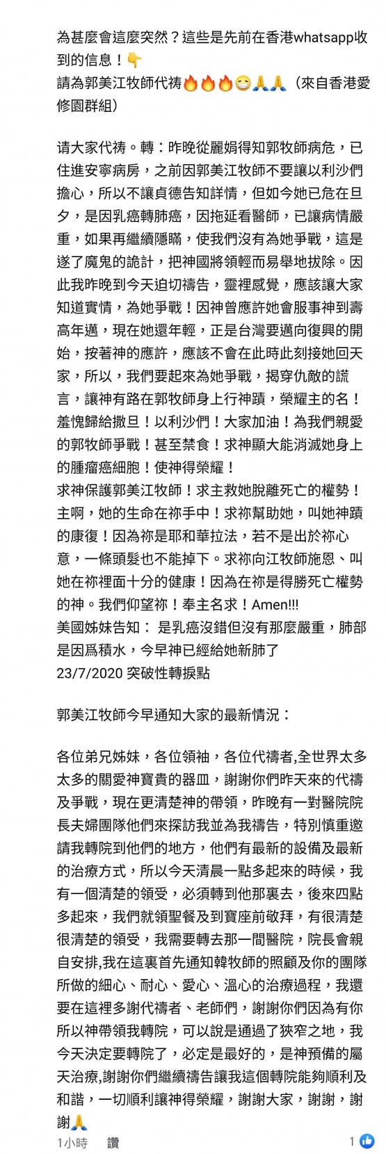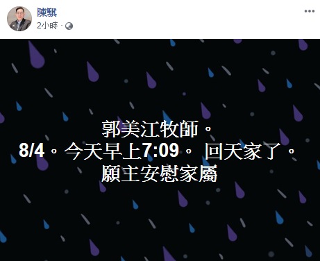 網友「陳騏」4日在臉書發文寫下,「郭美江牧師8月4日,今天早上7點09分,回天家了!願主安慰家屬!」接著引來一大批網友們紛紛留言表示,「是得鑽石的那位嗎?」、「真的是她!超突然!」、「是因為癌症才走的」、「太...難以接受了」、「郭美江牧師的訊息很正確,神榮耀的軍隊是單單屬於祂,今早她郭美江牧師已經回天家了」、「不是看到她寫的見證,快痊癒了嗎?!怎會突然...」、「上主賜福安慰安慰遺族並賜平安健康」。