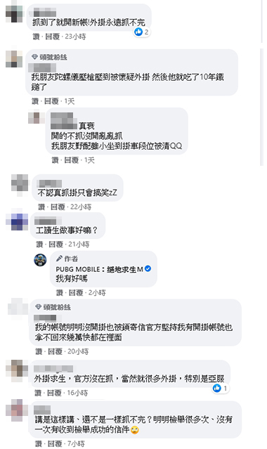 官方貼文一出,許多網友留言表示,「開的不抓,沒開亂亂抓。我朋友也是雖小,坐到掛車段位被清QQ。」、「講是這樣講、還不是一樣抓不完?明明檢舉很多次、沒有一次有收到檢舉成功的信件。」、「我朋友陀螺儀壓槍壓到被懷疑外掛,然後他就吃了10年鐵鎚了。」、「外掛求生,官方沒在抓,當然就很多外掛,特別是亞服。」、「我的帳號明明沒開掛也被鎖,寄信官方堅持我有開掛,帳號也拿不回來,幾萬塊都在裡面!」、「不認真抓掛只會搞笑zZ」、「抓到了就開新帳!外掛永遠抓不完!」、「工讀生做事好嘛?」。