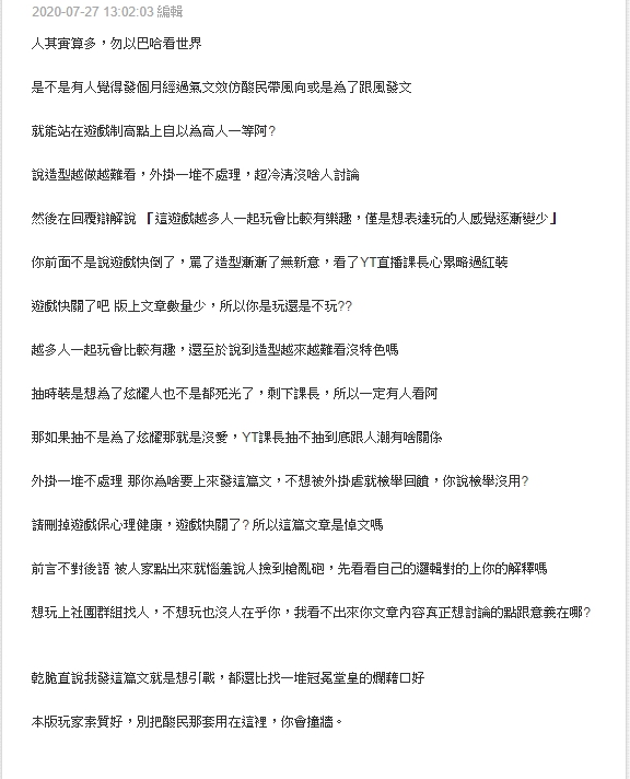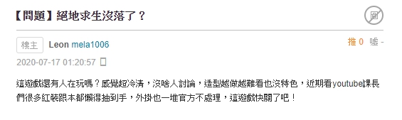 另外,近日也有網友在遊戲論壇中以「絕地求生沒落了?」為題發文詢問,指出該遊戲出新造型也不再有課長們抽造型,外掛問題也很多,質疑該遊戲快不行了!不過該名網友也遭到許多忠實玩家怒嗆表示,「想玩上社團群組找人,不想玩也沒人在乎你,乾脆直說我發這篇文就是想引戰,都還比找一堆冠冕堂皇的爛藉口好,本版玩家素質好,別把酸民那套用在這裡,你會撞牆。」