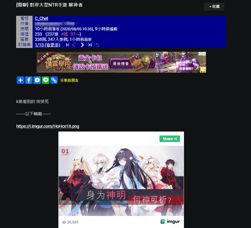 網友在PTT上以「對岸大型NTR手遊 解神者」為題發文討論,文章中提到中國有款名為《X2-解神者》的男性向劇情手遊,被投資方大範圍更改原先的遊戲設定,資方將遊戲從男性向更改為了女性向劇情遊戲,讓玩家(男一)變成了工具人,圍繞著所有女性角色奉獻心力,最終卻沒有得到任何回報,甚至最後玩家還將與女主角融合以女生身份與男二相戀,諷刺地劇情完全背離了這款遊戲當初的核心設定,因而引發了評測玩家們的怒火。