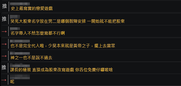消息一出不脛而走,在各大平台上瘋狂流傳,許多玩家紛紛留言表示,「史上最寫實的戀愛遊戲。」、「大股東名字放在男二是哪個智障安排,一開始就不能把股東名字帶入,不然怎麼寫都不行啊XD」、「少昊本來就是黃帝之子,擺上去當眾神之一,也不是說不過去。」、「課長的極致,直接成為股東改寫遊戲,你各位免費仔囉嗦啥呢?」、「我記得有個老哥說的很精闢,這劇情改不改都有問題,不改,玩家是武大郎。改了,玩家是西門慶。但不變的是女角色改不改都是潘金蓮!」。