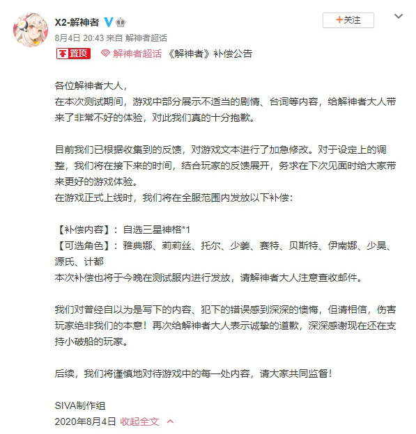 官方在直播說明會中,指出遊戲中男二(少昊)的名字來源是前公司大股東,因此才會有所有女性角色都以他為中心的設定,但官方承諾會改寫劇情,讓女性角色回歸好感度系統中能與玩家培養感情,不會再讓玩家當工具人,可是男二這個角色並不會被刪除。此外,該名網友在內文中表示原本的遊戲,不僅所有女性角色都被大股東搶走,最後連自己都被消失,這實在太苦悶了!