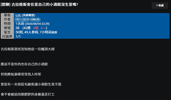 PTT網友以「古拉格斯會在意自己的小酒館沒生意嗎?」為題發文,在內文中貼出一段影片,只見一名背影和髮型都形似「統神」的男子,穿著藍色上衣短褲,脖子上披著毛巾,在廚房裡辛勤工作不慎因地滑而滑倒的影片,搭配上統神的聲音進行剪輯,瞬間讓許多網友紛紛感到逗趣。