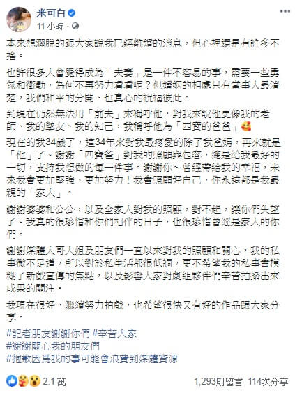米可白6日晚上突然在臉書發文宣布自己已經離婚的消息,並在內容中寫道,「到現在仍然無法用『前夫』來稱呼他,對我來說他更像我的老師、我的摯友、我的知己,我稱呼他為『四寶的爸爸』,謝謝四寶爸對我的照顧與包容,總是給我最好的一切,支持我想做的每一件事,你永遠都是我最親的『家人』!」