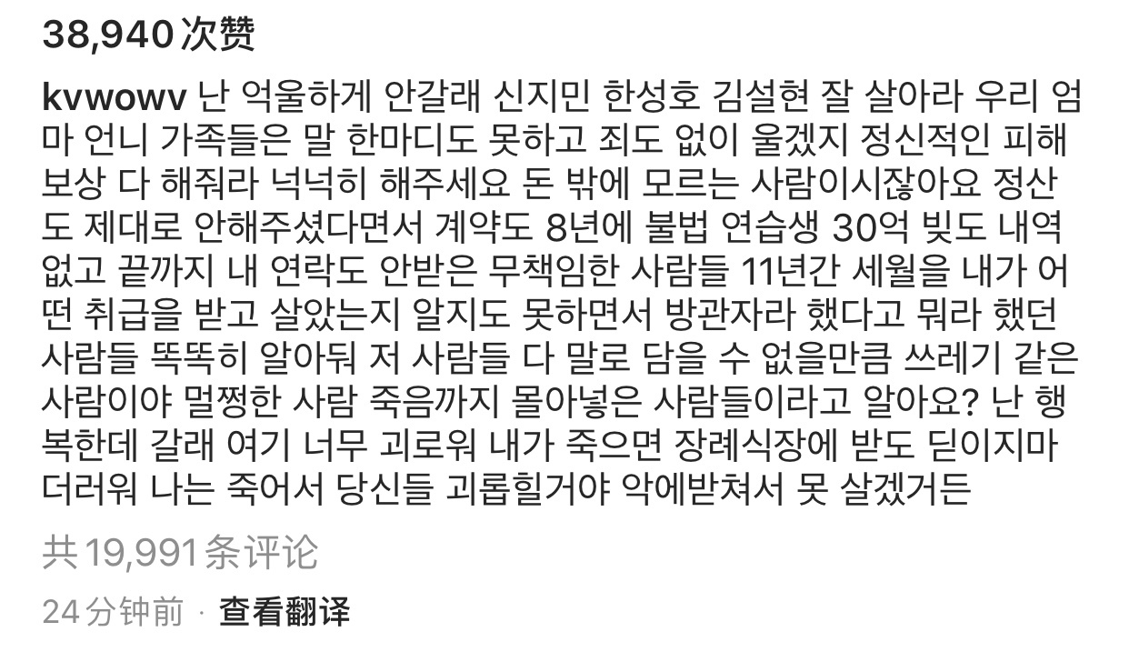 給精神損害賠償費吧,多給一點,你們不是只知道錢的人嗎?結算也沒有好好算清楚,合約是8年非法合約,練習生的30億債務也沒有明細,到最後也不理我的不負責任的人們。
