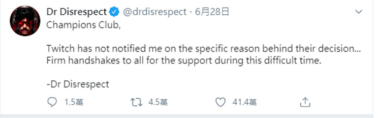 知名實況主「Dr. Disrespect」的實況魅力在於幽默的表演及精湛的遊戲技術,是實況圈中少數會做效果的遊戲高手,日前他的頻道被Twitch平台永BAN,是近期實況圈中最具爭議性的事件,因為Twitch平台始終沒有給出任何解釋,就將他的頻道進行了封鎖,時至今日也依舊沒有正面回應此事。