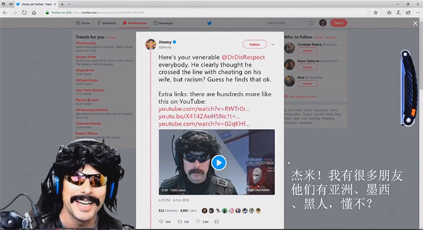 實際上,「Dr. Disrespect」在國際上的名聲是毀譽參半,因為他曾經在射擊遊戲「H1Z1」與中國玩家組成的紅衣軍爆發激烈衝突,導致在他之後的實況中時常出現貶低亞洲玩家的舉動,如混合著其他亞洲語言來對亞洲玩家胡亂喊叫等等,因而被許多亞洲玩家檢舉違反Twitch規範,引起許多玩家討論Dr. Disrespect這種行為到底算不算是惡搞而已。