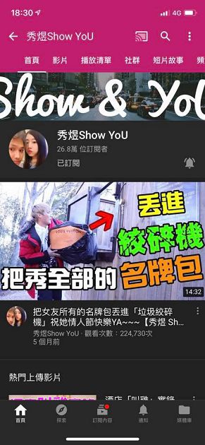 YouTube頻道「秀煜Show YoU」由秀、小煜共同經營,白目男友遇上暴怒女友,影片逗笑不少粉絲,不料近日卻發生頻道遭人盜走,不但喪失26萬粉絲,對方更用該頻道進行違法直播,讓帳號遭停權!