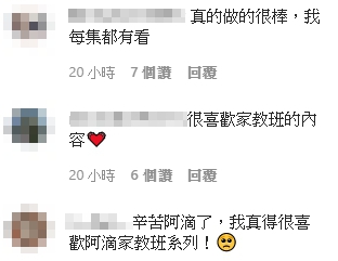 阿滴貼文一出,立刻有不少粉絲紛紛留言安慰,「真的做的很棒,我每集都有看」、「很喜歡家教班的內容」、「辛苦阿滴了,我真得很喜歡阿滴家教班系列」、「期待家教班重新出發的時候」、「哥你一直是最棒的」、「我覺得可能家教班影片節奏比較不一樣的關係,但我相信阿滴能夠找到平衡的」。