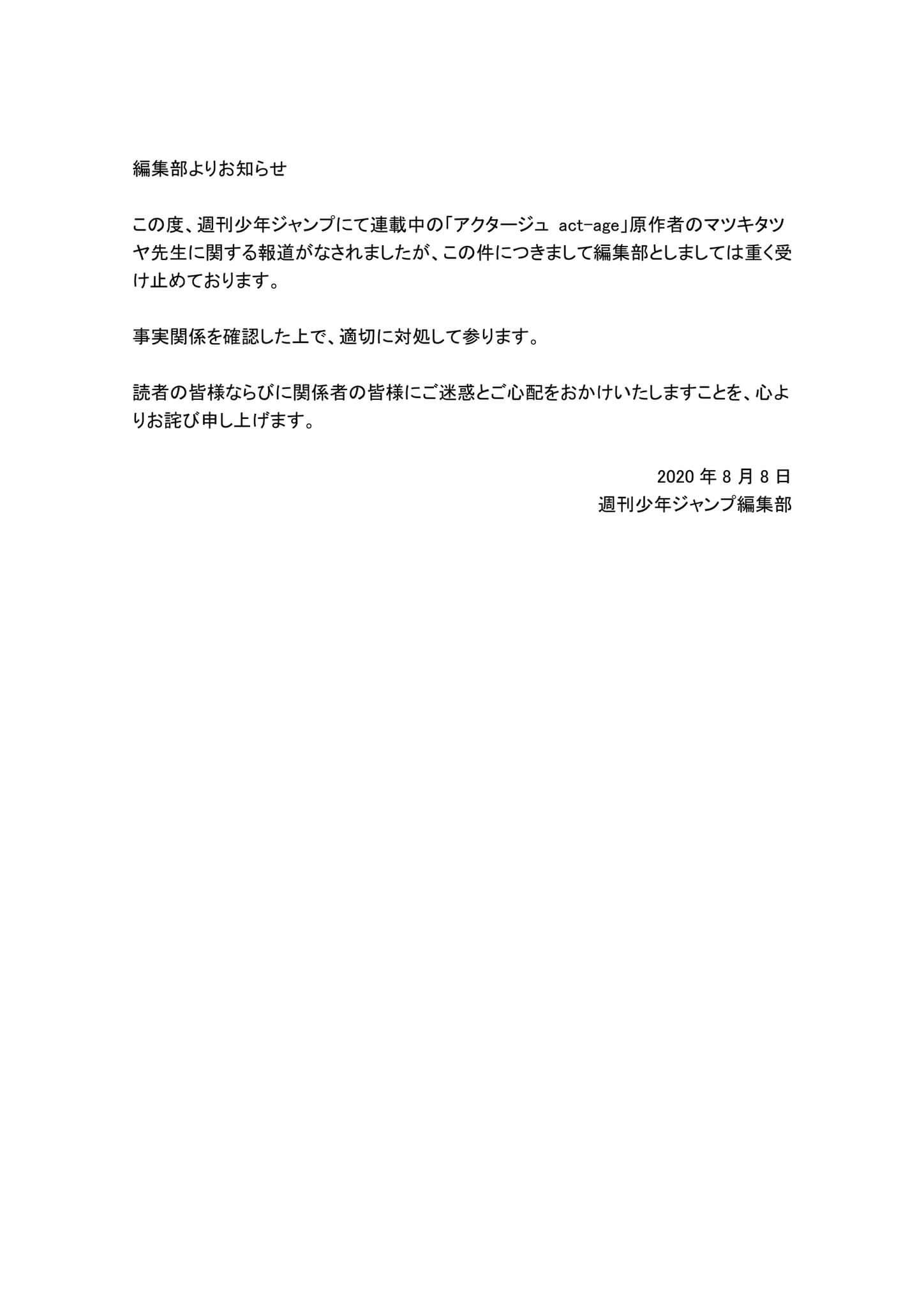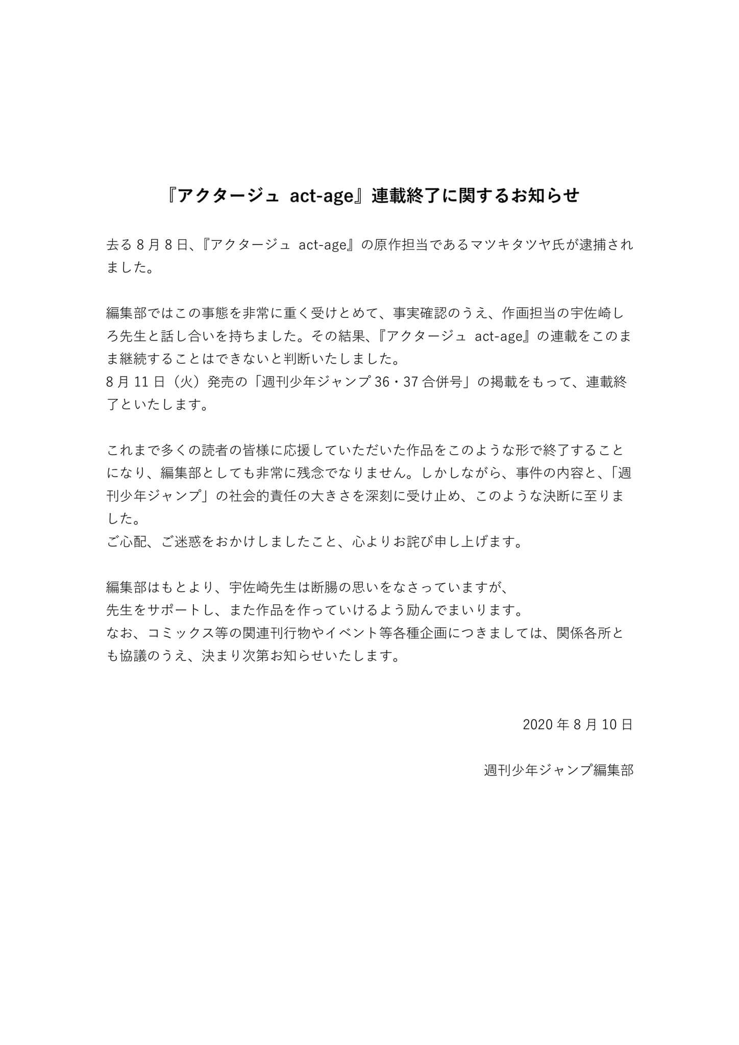 不過沒想到,畫出勵志劇情的松木達哉,近日卻被指控,於6月18日晚間8點左右,在日本東京中野路,騎腳踏車刻意接近女國中生,且在騷擾得逞後逃逸!事後經調查發現,當天居然不只一名女學生慘遭猥褻,警方揣測認為嫌犯為同一人,結果松木達哉在接受調查時,也坦承一切,隨即《週刊少年Jump》也做出回應:「編輯部對於此事非常重視,確認屬實後,將採取適當措施,對於讀者及相關人員帶來不便,深感歉意。」,後續也宣布決議結束該作品連載。