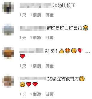 艾瑞絲貼文一出,立刻引許多粉絲大讚留言,「瑞絲的腿以前就很厲害」、「Beautyleg真的是腿控才知道的網站」、「正爆了!」、「懂拍」、「腿好長好白好會拍」、「太正了!長腿Aries」、「這長腳也太逆天了吧」、「犯規的腿!」。