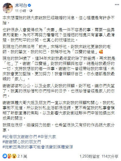 藝人米可白最近突然在臉書宣告自己離婚的消息,震驚了不少粉絲跟演藝圈的朋友們,畢竟跟他離婚的對象是身價上億的「尾牙大王」謝銘杰,兩人在結婚6年間並沒有爆出什麼大問題,不料竟突然就爆出了離婚的事情!而兩人的夫妻生活也隨之不斷被挖出各種不合的蛛絲馬跡,像是性事不合,遲遲肚皮沒有動靜,還有男方身邊桃花旺盛,讓米可白最後決定獨居小套房,帶著狗度過單身生活。