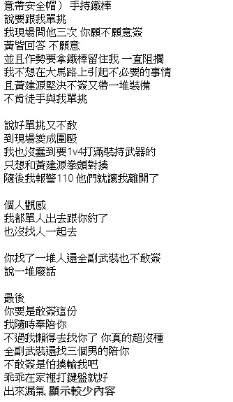 消息一經曝光後,消息就在網路上瘋傳,引起許多不同網友的意見,「娘砲不意外啊,單挑還烙人。」、「說單挑結果你帶三個人+鐵棒,還好意思理直氣壯的發文?」、「不敢簽免責,然後又說可以讓人家隨便打,等等打一打反過來吉,怎麼辦?連吃屎哥都知道要簽名,你裝B不敢簽呵!」、「Ad旁邊有SUP,再叫個JG是天經地義的事吧!」、「一個烙朋友的俗辣 跟一個被圍毆到重傷送醫院的BD仔,我選前面。」
