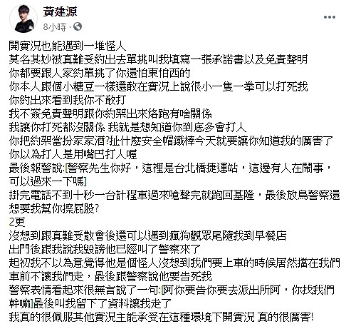 實況主「Breeze」隨後也在社群平台上發文回嗆,「開實況遇到一堆怪人」,自己要約單挑卻還顧慮一堆,甚至不敢打還報警落跑,要他們幫忙善後現場。此外,Breeze本以為沒事了,卻還遇到瘋狗觀眾尾隨他們至早餐店,甚至直接在現場叫警察說要告他誹謗,最後Breeze直呼「我真的很佩服其他實況主能承受這種環境下開實況,真的很厲害!」