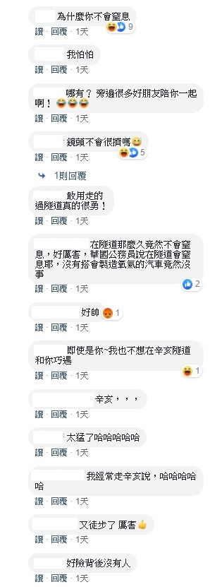 不少網友看到他的自拍照之後,都紛紛留言表示,「我也要去你的隧道」、「天啊~照片中...背後都沒有人車捏」、「讓我想起了《玫瑰之夜》的某張照片(疑」、「辛亥隧道之清潔婦」、「照片裡面很擠耶」、「聽說隧道內可以穿越時空!」、「那我也要常常去走,看能不能巧遇」、「小時候隧道上方有很多墳墓,經過時都緊閉眼睛」、「你完全不怕啊,以後要稱呼你為吳大膽了!」、「看起來慷仁喜歡涼感空氣!」。