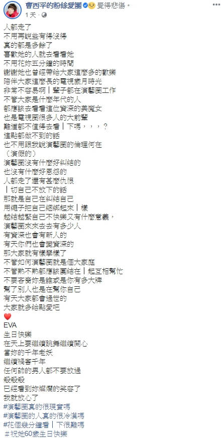 接著曹西平也提到,「演藝圈沒有什麼好糾結的,也沒有什麼好恩怨的!人都走了還有甚麼仇恨,一切自己不放下的話,那就是自己在糾結自己,用繩子把自己綑綁起來一樣,越結越緊自己不快樂又有什麼意義?演藝圈來來去去有多少人,有資深也會有新人的,有天你們也會變資深的,那大家就有樣學樣了,不管如何演藝圈就是個大家庭,不管熟不熟都應該團結在一起互相幫忙,不要吝嗇妳是誰或是你有多大牌,幫了別人也是在幫你自己,有天大家都會過世的,大家就多給點愛吧!」