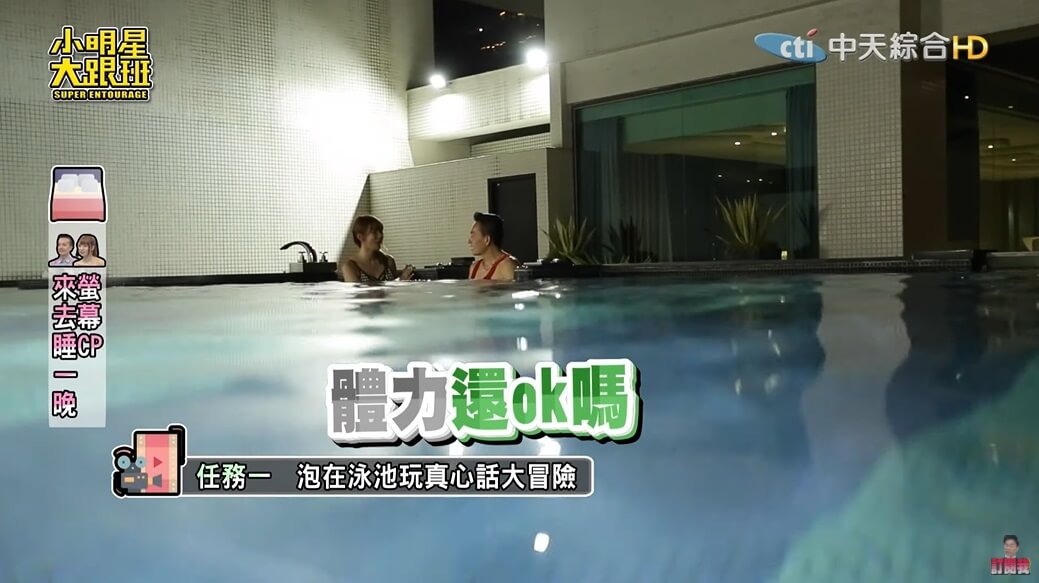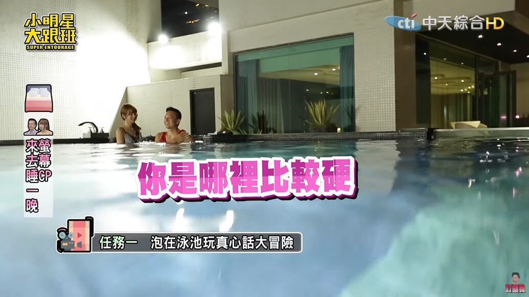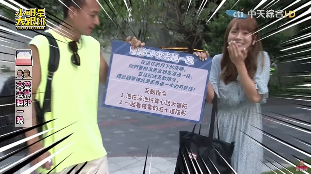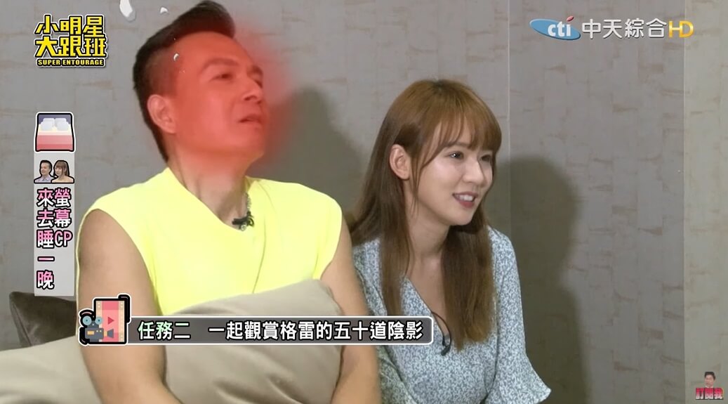後來兩人進行下一個挑戰,要一起在房間裡面看《格雷的五十道陰影》,看到兩人都忍不住害羞了起來,連小鐘都趕緊拿著抱枕擋住重點部位!後來直接改成唱歌來結束這個尷尬又緊張的氛圍。最後要睡覺時,小鐘還把兩人的枕頭靠很近,兩人還一起在床上示範跟男女朋友一起睡覺的姿勢,動作相當親密,讓小鐘興奮到整張臉爆紅,直呼「好久沒有這樣了,我忍不住!我開心!」