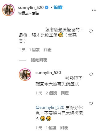 不少粉絲在看到采緹的回覆之後,也都紛紛湧入留言表示,「好擔心!」、「采緹真的要好好休息」、「身體健康很重要」、「臉真的怪怪的耶」、「左右臉真的有差!」。而采緹最後也跟粉絲回應說,「沒事沒事,正在好好治療中!」