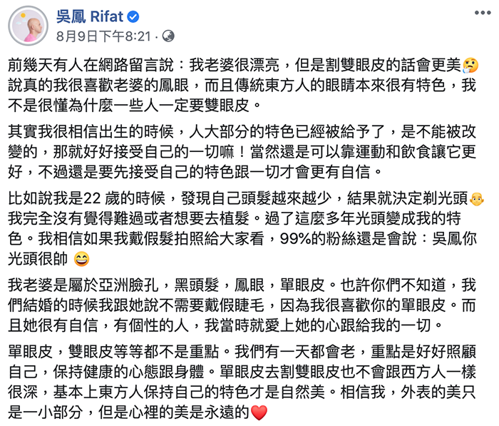 近日吳鳳老婆再度因為外表被酸民攻擊,有網友在吳鳳帶著一家人去拍攝全家福的影片下表示「吳鳳老婆如果眼睛拿去割雙眼皮一定是大美女」,讓他再度於臉書發文回應:「其實我很相信出生的時候,人大部分的特色已經被給予了,是不能被改變的,那就好好接受自己的一切嘛!當然還是可以靠運動和飲食讓它更好,不過還是要先接受自己的特色跟一切才會更有自信。」更表示自己很愛老婆的鳳眼以及自己的光頭,最後不忘呼籲「外表的美只是一小部分,但是心裡的美是永遠的」。