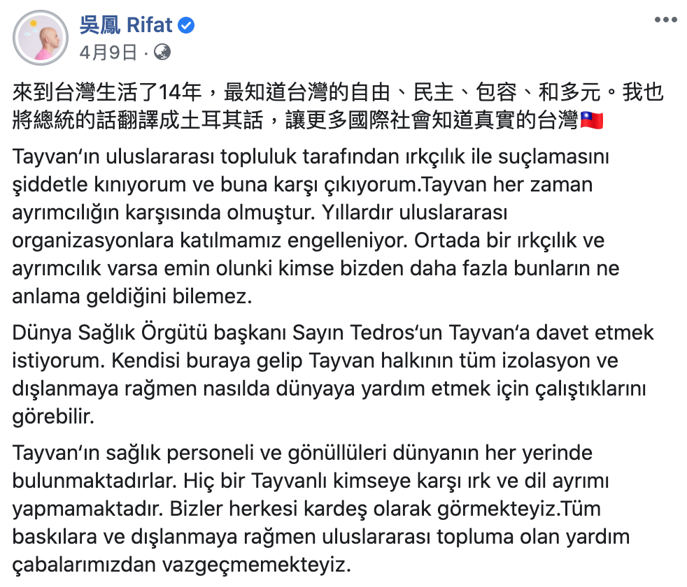 吳鳳過後在自己的臉書將總統的貼文翻譯成土耳其文,希望能讓更多人聽見台灣的聲音,更在自己的Youtube頻道上傳影片「台灣給全世界的一封信」,表示自己「從抵達台灣的第一天起,都享受著台灣的民主、人權、公平、安全,跟世界最好的醫療制度。」力挺台灣的行為獲得網友大讚「最佳台灣代言人」、「所有的光頭,偶就最愛你這顆了」、「比台灣人更愛台灣」。