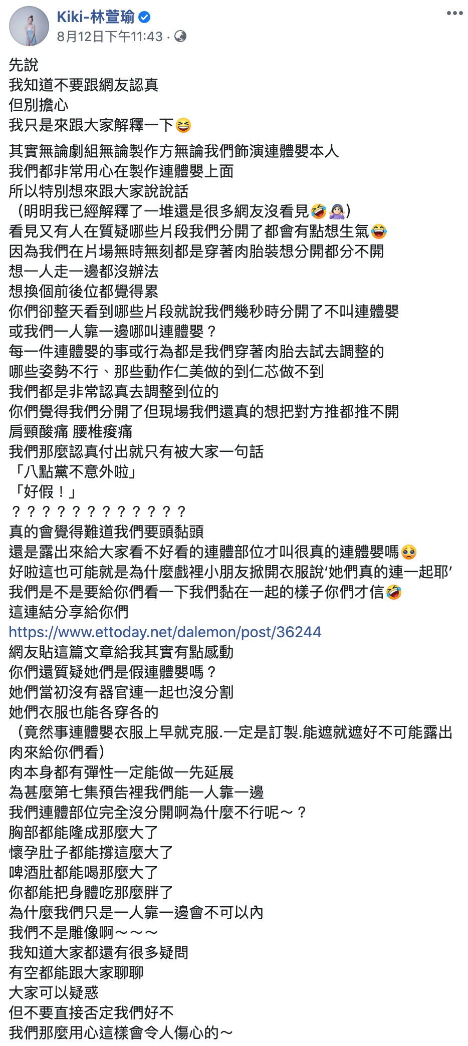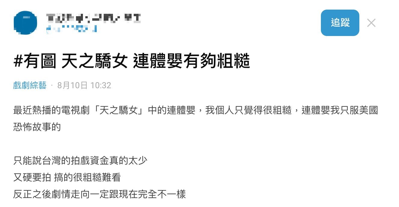 日前就有網友在Dcard發文質疑劇中的連體嬰畫面「穿幫」,指出兩人在沙灘時跟溺水後的身體位置似乎互換了,過後也有網友批評連體嬰的畫面「製作粗糙」,更搬出美國經典影集《美國恐怖故事》中的連體嬰互相比對,開始在網路上掀起論戰。