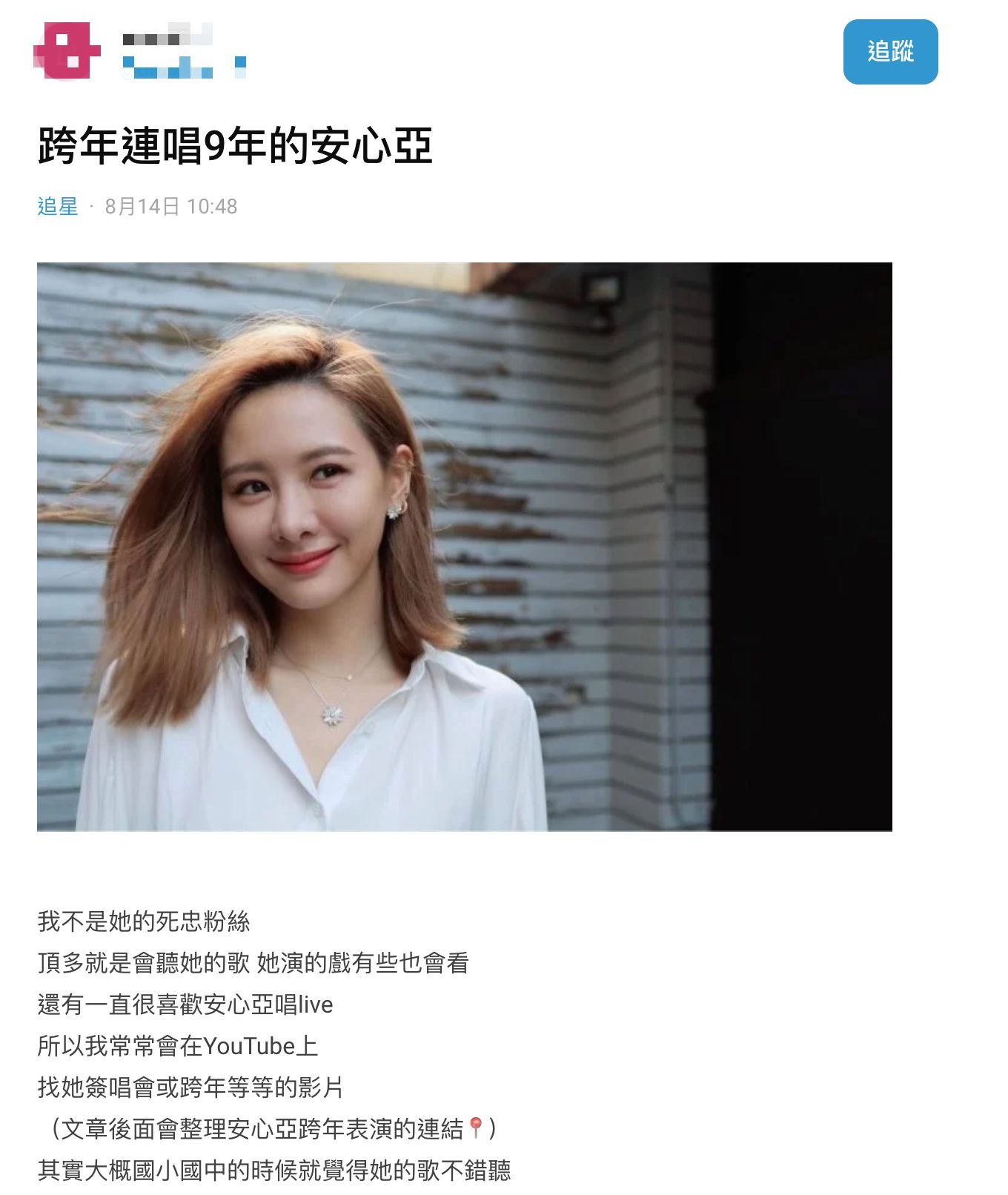 該網友表示自己其實並非安心亞的死忠粉絲,但有時候覺得安心亞的歌還不錯,也會找她的表演影片來看,才發現她連續9年都有在跨年演唱會上表演,而且一年比一年更進步,讓他對安心亞的印象徹底改觀。許多人對安心亞的印象都停留在「宅男女神」的時期,但其實安心亞一直力求完美,也不斷努力突破自己,不僅可以拿著吉他自彈自唱,也認真練舞,練到肢體老師都跟她說「妳的肌肉整個都在告訴妳它已經快不行了」,才讓她在朝著目標不斷前進的過程中停下來學會關愛自己。