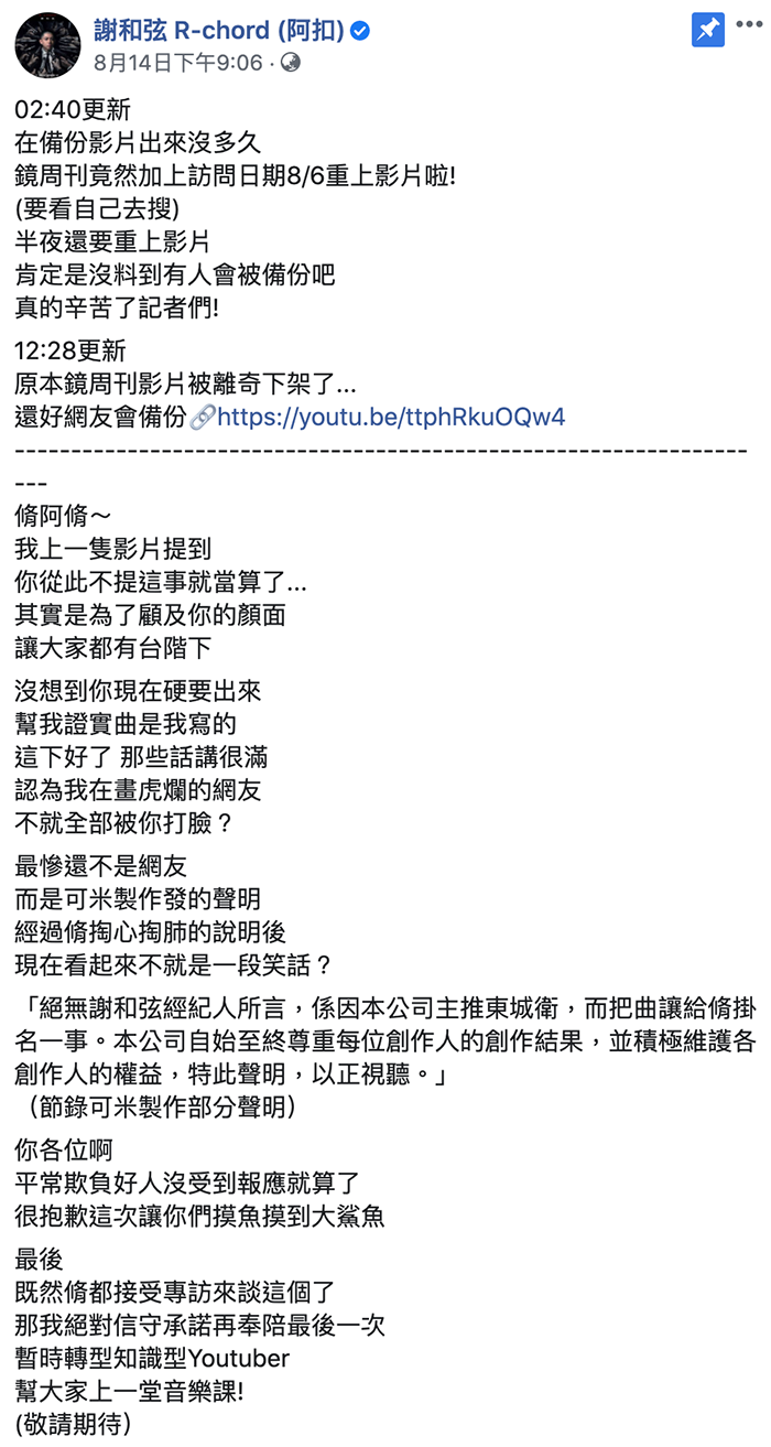14日脩在臉書再度發文,這次一改先前溫和的態度,強硬表示:「關於版權問題,目前已交給公司及專業部門全權處理,我就不便多說。公司立場目前唯一可以確定的是,根據現狀,避免陷入其他不必要的風波,未來皆無授權的可能性。」等於正式與謝和弦鬧翻。謝和弦則在臉書回應:「你從此不提這事就當算了⋯⋯其實是為了顧及你的顏面,讓大家都有台階下,平常欺負好人沒受到報應就算了,很抱歉這次讓你們摸魚摸到大鯊魚。」最後更放話要轉型知識型Youtuber「幫大家上一堂音樂課」,請網友們敬請期待,似乎準備要再拍影片回應版權爭議。