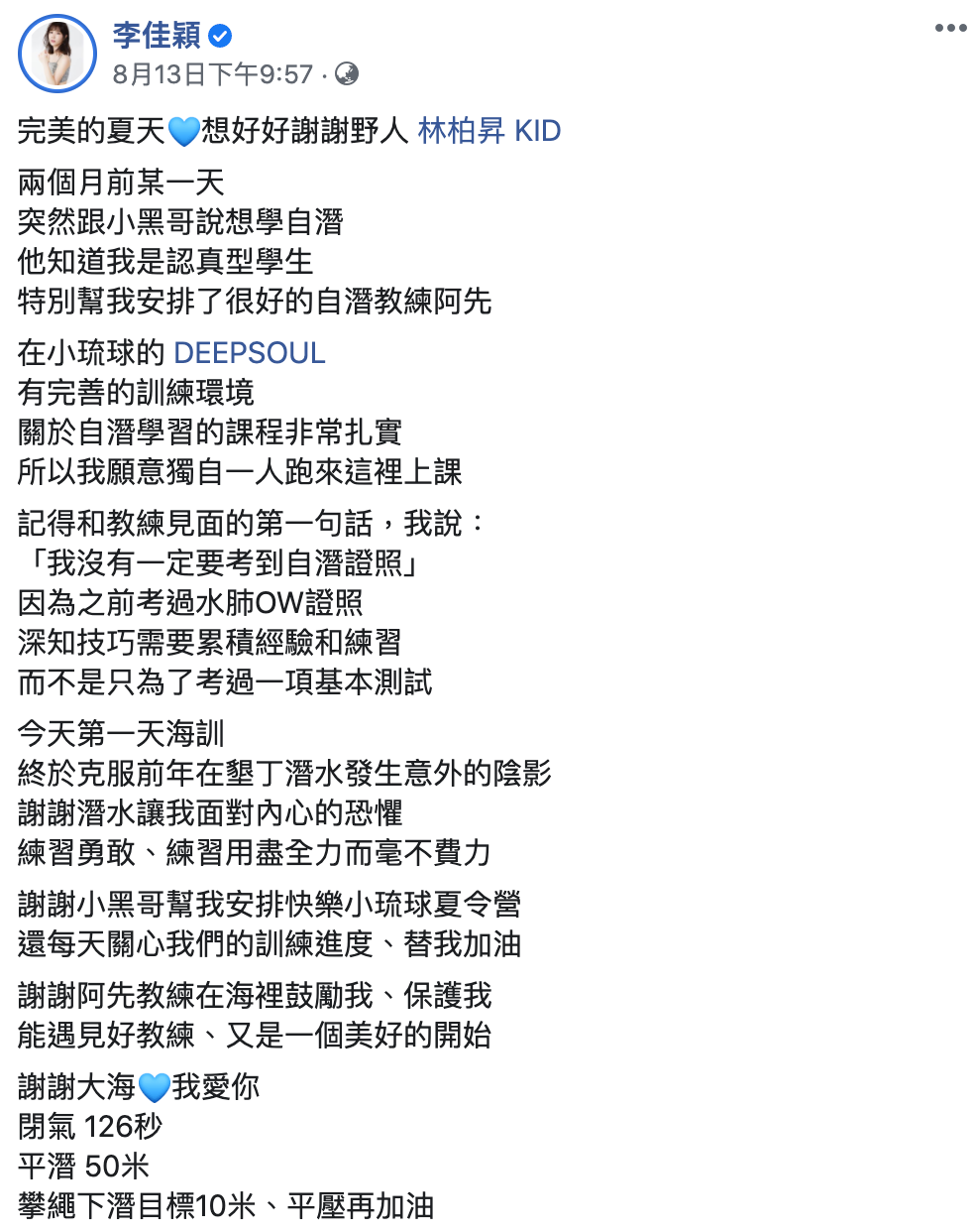 14日李佳穎曬出身穿潛水服的美照,只見她仰躺在海面上,細腿交疊宛如美人魚,她過後寫下長文分享學會自潛的心得:「今天第一天海訓,終於克服前年在墾丁潛水發生意外的陰影,謝謝潛水讓我面對內心的恐懼,練習勇敢、練習用盡全力而毫不費力。」成功克服心理恐懼的她連續po出多篇在海中的照片、影片,不難看出學會自潛後的她非常開心,文末她更感性告白:「謝謝大海,我愛你!」