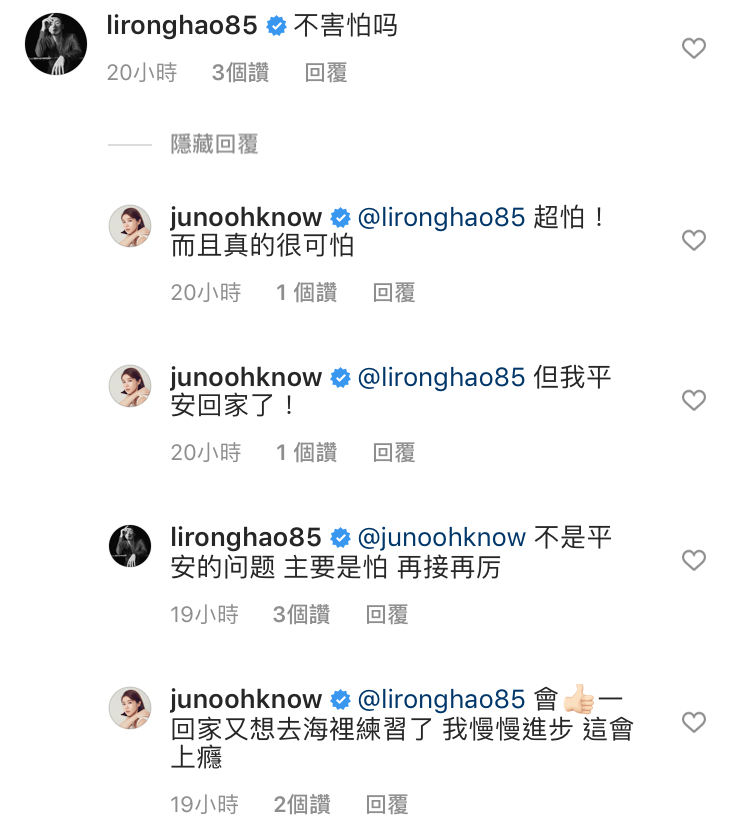 貼文公開後意外引來李榮浩留言回應:「不怕嗎?」李佳穎回覆:「超怕!而且真的很可怕!但我平安回家了!」對方又回:「不是平安的問題,主要是怕,再接再厲。」李佳穎則回覆:「一回家又想去海裡練習了,我慢慢進步,這會上癮。」最後她心滿意足地表示:「完成喜歡的事,一個人安靜、害怕、再勇敢,很喜歡這樣的自己。謝謝今天混濁海水中的陽光,滿滿能量、心情超好,非常願意乖乖回家準備拍戲了。」