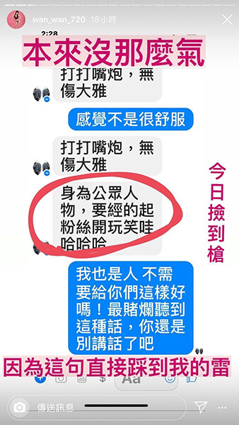 不料,近日宛宛兒在社群軟體上透露,自己最近看到網友大肆亂她開玩笑,對方先表示「打打嘴砲,無傷大雅。」,而宛宛兒回覆感覺不是很舒服之後,對方則指她為公眾人物要經得起粉絲開玩笑,宛宛兒見狀,霸氣回嗆「我也是人,不需要給你們這樣好嗎!最賭爛聽到這種話,還是別講話了吧。」。