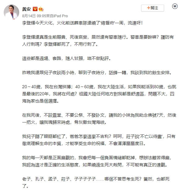 黃安最近看到前總統李登輝的送葬過程,突然感觸很深的跟兒子聊天聊了2個小時,還在微博發文寫道,「20~40歲,我在台灣拼搏;40~60歲,我在大陸生活,如果我能活到80歲,也就是最後的20年,我將在何處?祖國大陸任何地方對我都是舒適區,問題不大,四海為家也是個選擇!」