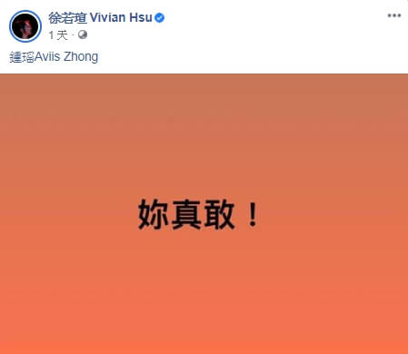 藝人鍾瑶在2019年拍電影《狂歡時刻》時,跟演員曹晏豪擦出了愛的火花,後來兩人也是非常大方的認愛,完全不在乎他人的眼光,但沒想到最近她又突然在臉書發文寫下,「我們相愛與你何干?」引起了網友們的注意,大家都紛紛留言詢問這則貼文是「什麼意思?」沒想到隔了一天徐若瑄竟發文寫下「你真敢!」並Tag鍾瑶,讓網友們看了都霧煞煞,掀起熱烈的討論!