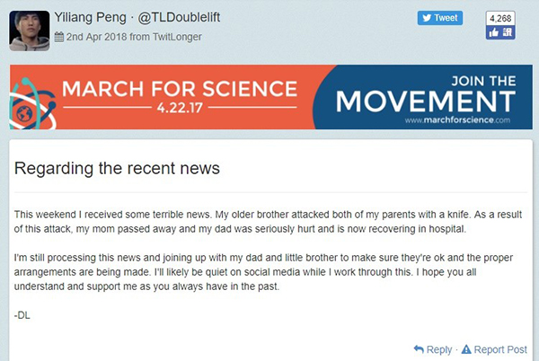 實際上,Doublelift的電競路非常曲折,在他18歲後就被華人傳統的父母趕出了家門,靠著自己那時即將到手的1000美元獎金與網友的援助,最終他才能走上電競這條路,過了數年才改善了與父母的關係,不料,2018年他的親哥哥在美東時間3月持刀攻擊父母,導致母親去世,父親受到嚴重傷害,目前仍待在醫院治療中。他在遭遇了這樣的家庭悲劇後,依舊努力逐夢,許多網友都紛紛表示這樣一名永不言棄的選手是值得尊敬的。