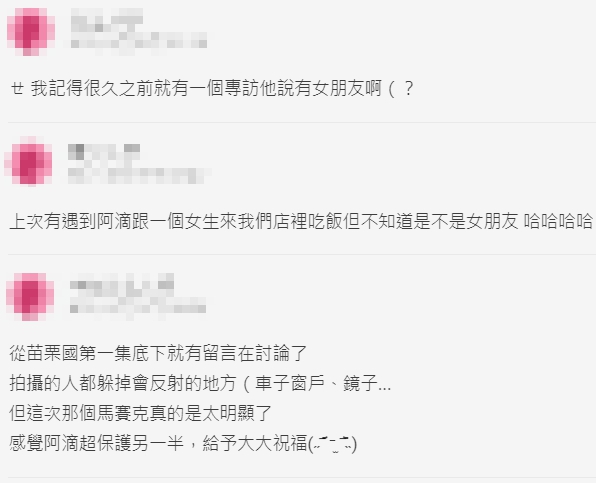 粉絲們在Dcard分享蛛絲馬跡,立刻引起許多討論,「感覺阿滴超保護另一半,給予大大祝福」、「很開心阿滴找到另一半」、「當滴哥女朋友感覺就很幸福」、「如果是的話恭喜他啊」、「看來阿滴真的很保護他女友更喜歡他了」。