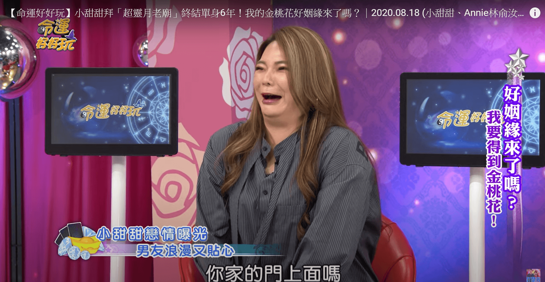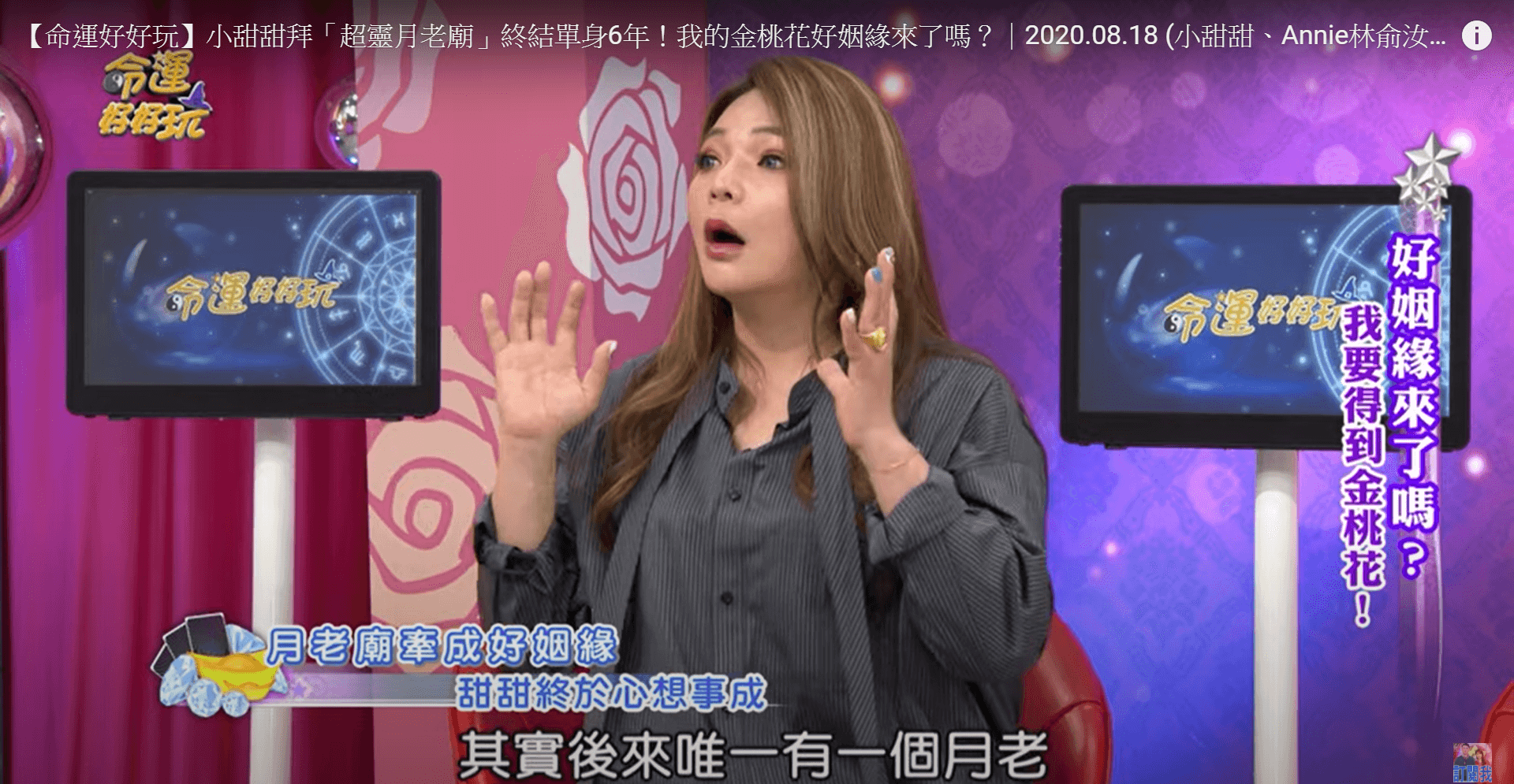 此外,小甜甜在節目中也提到自己有拜月老求姻緣的習慣,從台灣拜到國外,但她的感情始終沒有起色,不過讓她最意外的是,有一個同學去拜了日月潭的月老廟後,竟有了好結果!她也特別提到,「我同學外表其實也不是什麼好看的女生,身材也很普通」,但拜完月老後,有一次她被打錯電話,掛掉之後對方竟回撥說,「你的聲音很好聽!」,就在這樣的因緣際會下,他們兩人進而交往,前陣子甚至步入婚姻,讓小甜甜下定決心去日月潭朝聖,但後來得到了三次陰筊的結果,只好無奈的回家,不過之後她依然遇見了愛她的人。