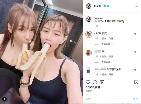 網路正妹「邱默默」擁有甜美顏值與姣好身材,時常在IG上分享各式誘人的福利照,日前更與好友「青青」一同在IG影片中展現舌技,兩人搞怪地表演「大吃香蕉」,讓許多粉絲受不了直呼,「不要玩食物!」、「安捏母湯喔」。