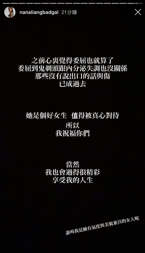 此外,梁云菲也直說,「祝福兩字說起來簡單,但要真心真意、誠心誠意,很抱歉,我沒有!我有兩分埋怨、一分憤慨,剩下七分才是祝福,那七分也是給她的,你一分都沒有!」而其實,梁云菲也曾發限動寫下,「之前心裡委屈就算了,委屈到鬼剃頭跟內分泌失調也沒關係,那些沒說出口的話跟傷,已成過去!她是個好女生,值得被真心對待,所以我祝福你們,我也會過得很精彩享受我的人生!」還不忘幽默的笑說,「誰叫我是擁有氣度與美貌兼具的女人呢~」。後來也有不少網友給予梁云菲鼓勵,希望她可以過得越來越好。