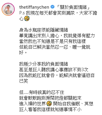 彥婷一向擅長隱藏情緒,總是自己消化,展現樂觀積極的一面,不料近日陷入低潮,甚至默默掉淚,「即使再怎麼正面、樂觀、催眠自己,有時候無心之話往往卻像一把劍,你無意,但文字無情」。隨後彥婷也解釋,懷孕之後常收到這類私訊,一開始陷入憂鬱,直到現在終於可以豁達回覆,「相信我!等我生完我會瘦回來給你看!而且我會標記你!」。