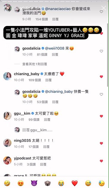 愛莉莎莎貼文一出,不只知名YouTuber們紛紛留言,更引來5萬多名網友按讚,「可愛哭」、「真的好可愛啊啊啊」、「莎莎比法鬥可愛」、「莎姐好美」、「無尾熊和小狗都很可愛」、「人好像比狗還萌」、「法鬥好小好可愛哦」、「鄰居:讓狗成功登上莎莎版面了,計畫通成為網紅狗」。