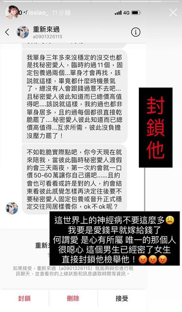 隨後對方更提到,要閃亮亮立刻去陪他,約會三天兩夜,一口價「50萬-60萬」任她挑選,約會結束後可以再評估,是否可以交往、固定包養、或者以正式穩交同居的方式養她也沒問題。