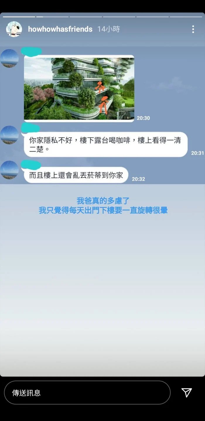 HowHow日前在IG限時動態上傳了跟父親的對話截圖,How爸傳了一張陶朱隱園的照片給HowHow,並寫上「你家隱私不好,樓下露台喝咖啡,樓上看得一清二楚,而且樓上還會亂丟煙蒂到你家。」HowHow則在IG表示:「我爸真的多慮了,我只覺得每天出門下樓要一直旋轉很暈。」