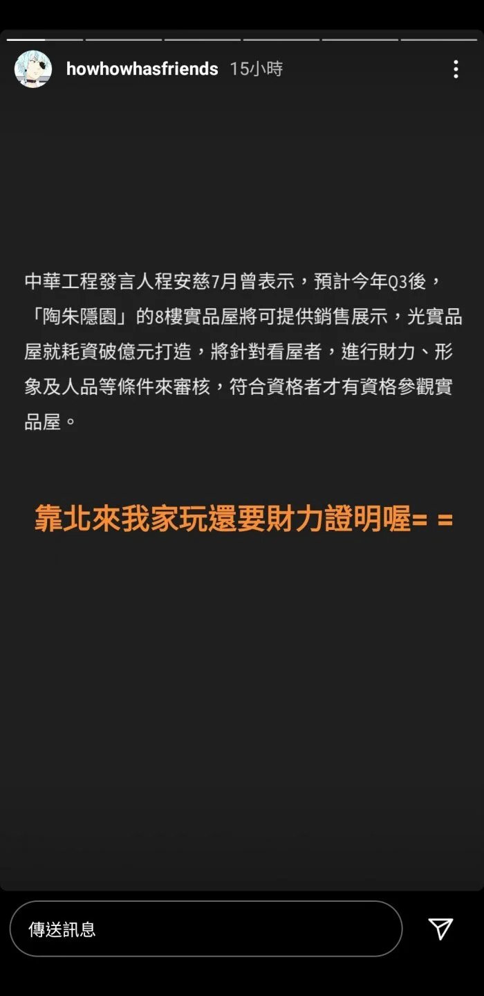 過後他又發布一則限時,貼上陶朱隱園的公告:「陶朱隱園的8樓實品屋將可提供展示,光實品屋就耗資破億元打造,將對看屋者進行財力、人品及形象等條件來審核,符合資格者才有資格參觀。」讓HowHow忍不住吐槽「來我家玩還要財力證明喔」。