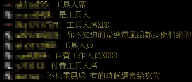 文章一出,立刻爆掛引起鄉民們注意,紛紛留言表示,「工具人席」、「自費工作人員XD」、「付費工具人席」、「不只電風扇,有的時候還會給吃的」、「可悲台男席」、「火山孝子席阿,girl手又沒東西自己撐很難一樣」、「每個手都閒著放膝蓋,讓人撐傘,真的好笑」、「 工具人做到這樣真可悲~」。