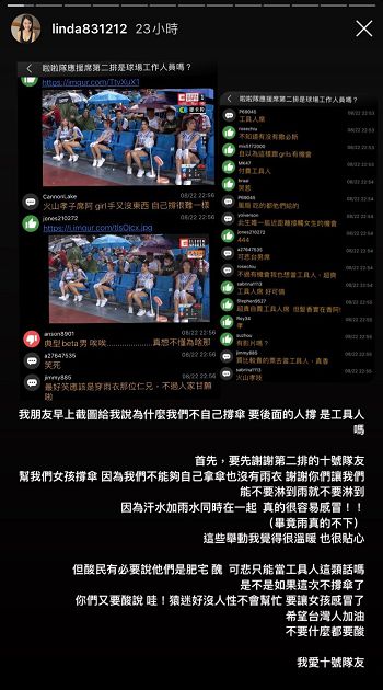 面對PTT爆掛討論,樂天女孩「琳妲」也發聲表示,感謝第二排的「十號隊友」幫忙撐傘,解釋女孩們不能夠自己拿傘,也沒有雨衣穿,「謝謝你們讓我們能不要淋到雨,就不要淋到,因為汗水加雨水在一起,真的很容易感冒!這些舉動我覺得很溫暖,也很貼心」。同時琳妲也痛批酸民,沒必要因此就說他們是肥宅、醜、可悲工具人等話,「希望台灣人加油,不要什麼都要酸」!