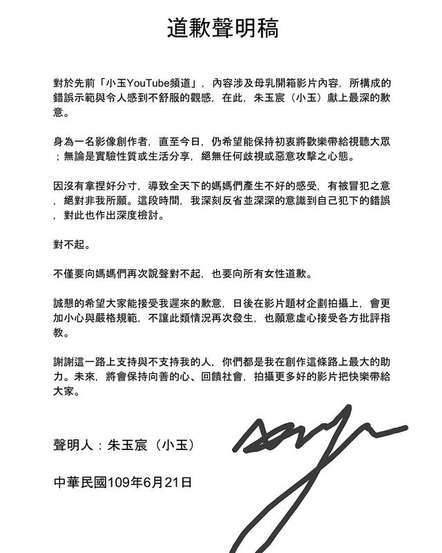 小玉4月初時,在頻道中開箱「母乳」,過程中卻稱母乳有吉娃娃的味道,頻頻作嘔直呼難喝,隨後又將母乳搭上許多東西食用,包括Oreo、珍珠等,誇張的實驗行為,立刻引來媽媽們眾怒撻伐。小玉隨後也在頻道中上傳道歉影片,下跪認錯,向全天下媽媽們道歉,再三認錯,哽咽請求大家能再給他一次機會。