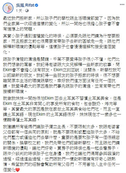 藝人吳鳳跟老婆陳錦玉結婚之後,兩人一起育有兩位可愛的女兒,目前一家四口可以說是過著相當幸福美滿的日子,不過最近他們家剛搬到新家,讓孩子們的學校生活跟家庭生活都會有些改變,讓吳鳳很擔心兩個孩子在適應上可能會有些問題,不過他也在臉書上跟網友們分享「千萬不要覺得孩子很小不懂!」引起了熱烈討論。