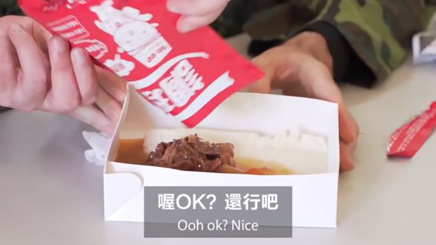 影片最後他們開箱最特別的「加熱式軍糧」,裡面內含超豪華的「牛肉飯」,只要將水、調理包、飯放在加熱包一起加熱,靜待幾分鐘之後即可開封食用,美味程度讓「營養健身葛格Peeta」直呼:「這看起來比我們當兵時的食物還好吃!」